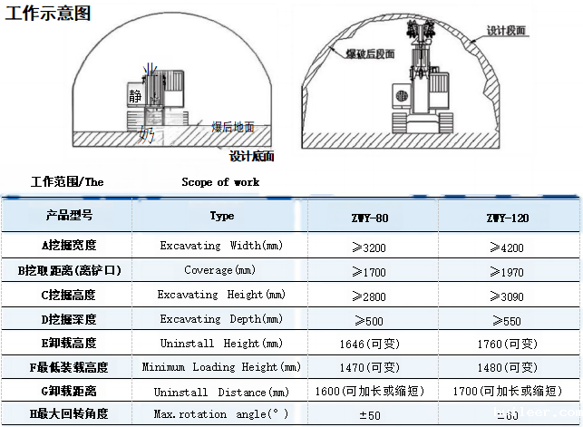 配备铣挖头后,可在硬度4F的煤巷或半煤巷掘进时工作,无需炮掘。本机带有快速连接器,岩 巷掘进时挖斗和铣挖头互换,爆破后用挖斗装渣,实现了一机两用;